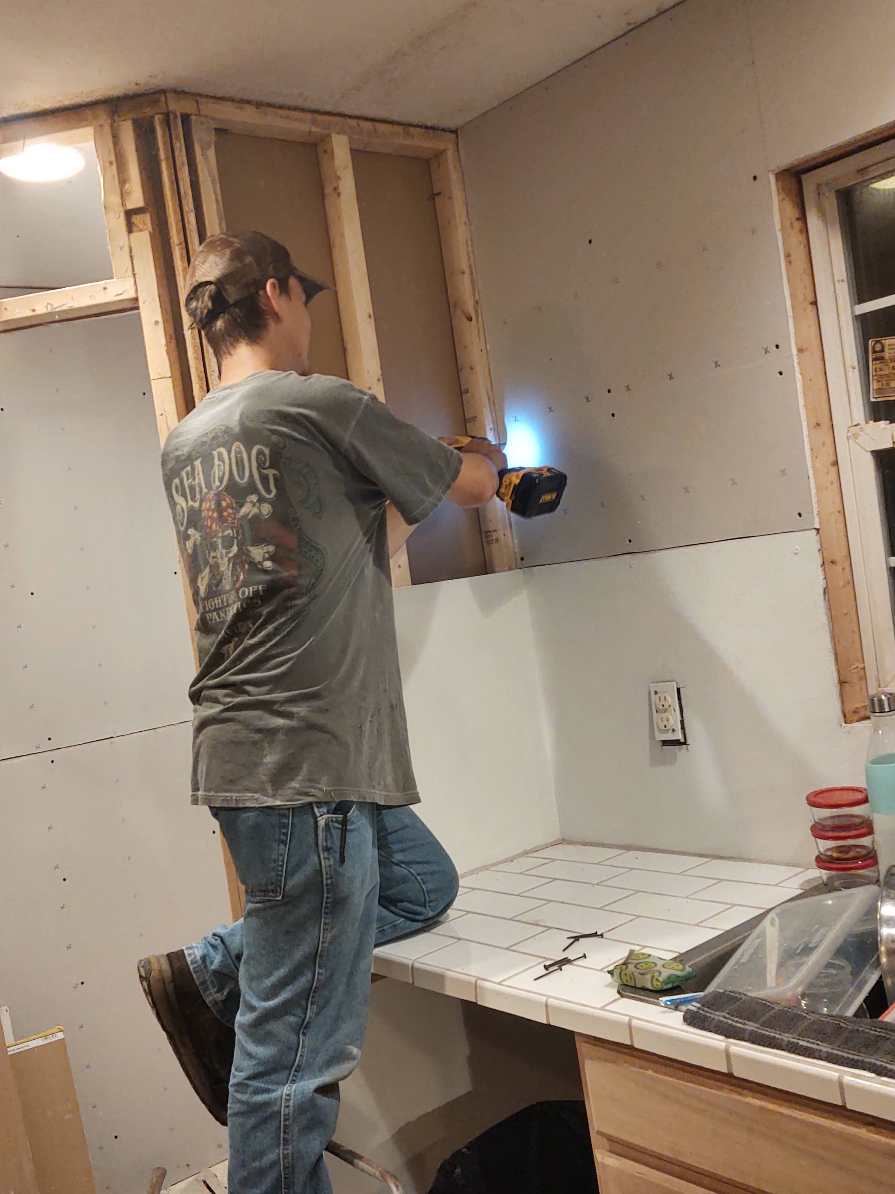 We had ripped out the shelving system and walls months ago so it was long overdue to get some put back up. Thanks to him, my house is slowly but surely becoming whole again. Starting with my kitchen. My house hasn’t seen flooring in a very long time and there is no excuse for that, only poor mental health and very little time and money to get things installed like they should be. Things are changing for the better and the house is included but between work, school and my mental health I have a hard time getting things fixed on my own. So having a handy brother is… well, handy.